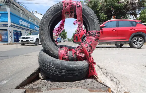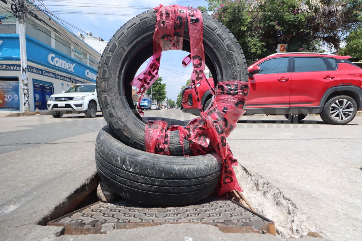 En la esquina de la avenida 9 Norte y calle 3 Oriente de la capital chiapaneca, una alcantarilla hundida permanece como un riesgo constante para quienes transitan por esa zona. Ante la falta de atención por parte de las autoridades, vecinos colocaron unas llantas con una cinta precautoria sobre el desperfecto, para evitar que automovilistas caigan o que peatones sufran algún accidente.