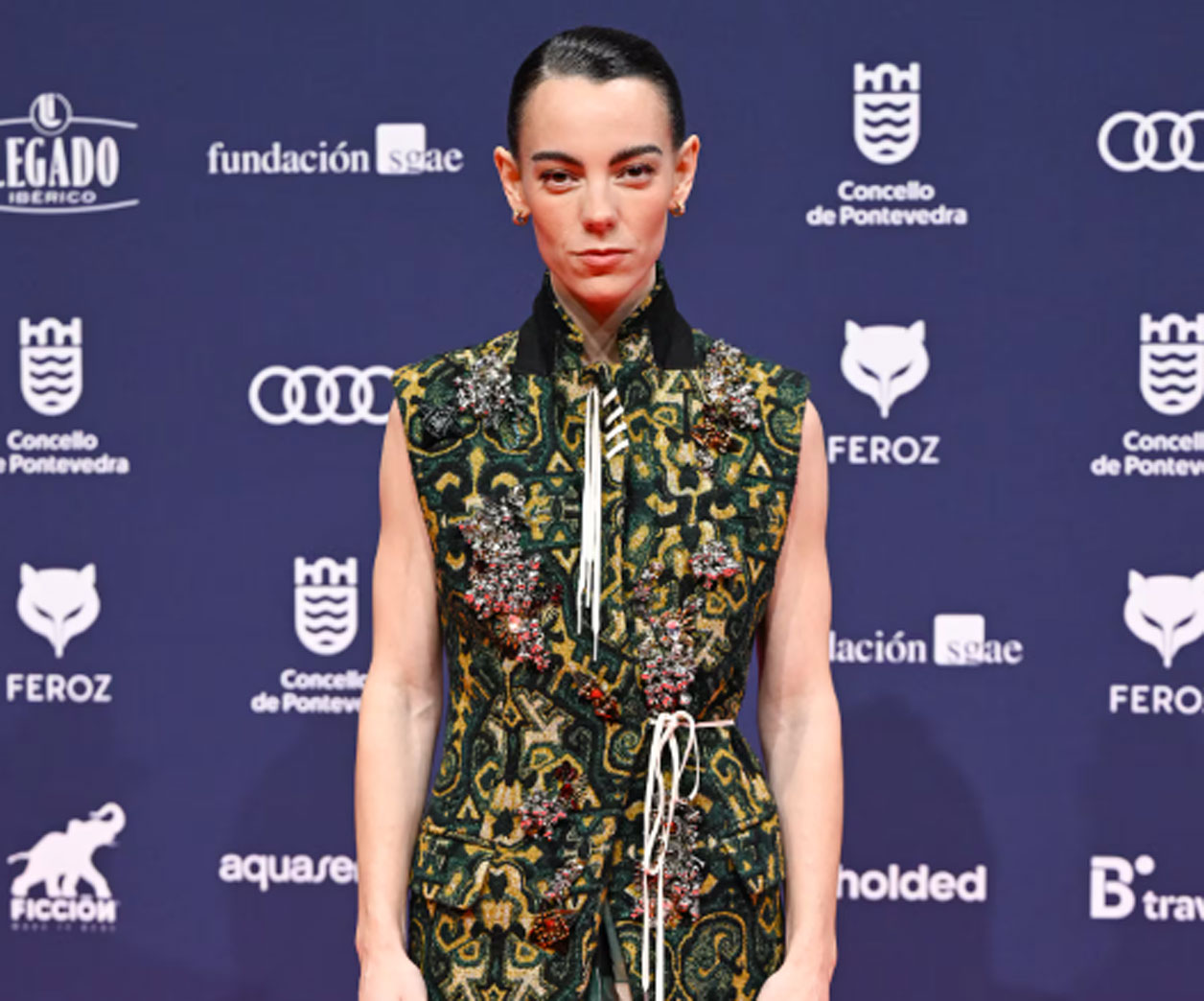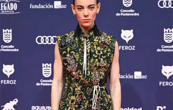 Victoria Luengo, una de las protagonistas de la próxima película de Pedro Almodóvar, Amarga Navidad, que se estrenará en marzo. Para asistir a la entrega de premios en Galicia, la actriz escogió un diseño estampado con bordados de Dries Van Noten.