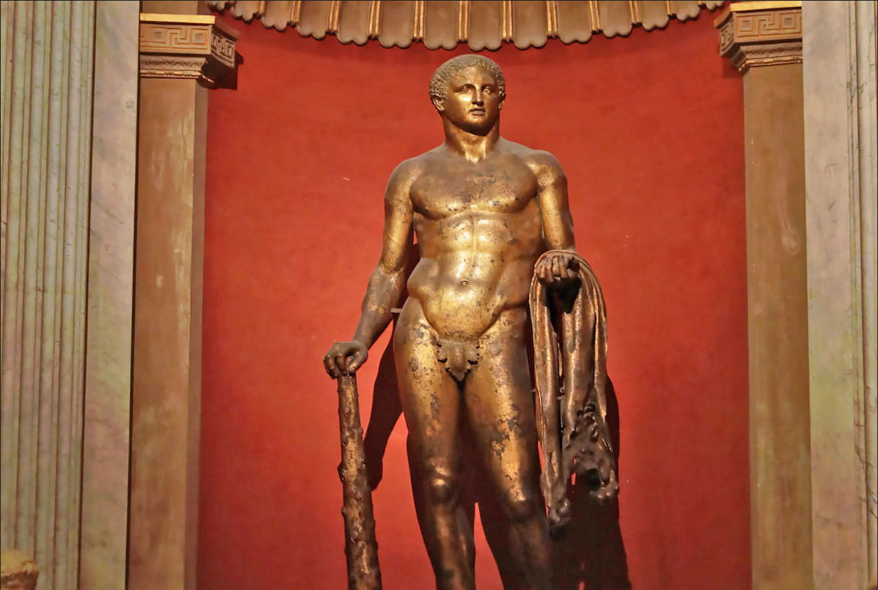 Gracias a eso se pudo conservar la gran escultura de Hércules, una copia romana de un original helenístico del siglo IV a. C., que representa al héroe joven apoyado en su garrote y con las manzanas de las Hespérides en la mano izquierda. En el antebrazo lleva la piel del león de Nemea, principal elemento que descubrió de qué personaje se trataba.