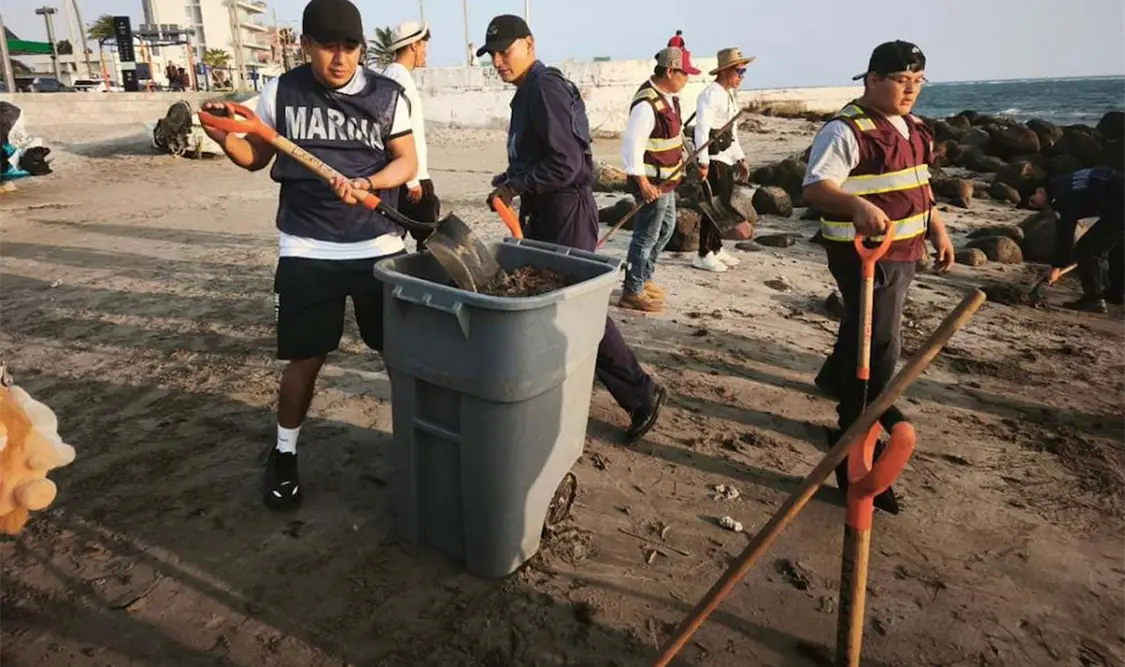 Elementos de distintas corporaciones e instituciones llevaron a cabo la limpieza de 34 playas del centro y sur de Veracruz que habían sido afectadas por manchas de hidrocarburo.