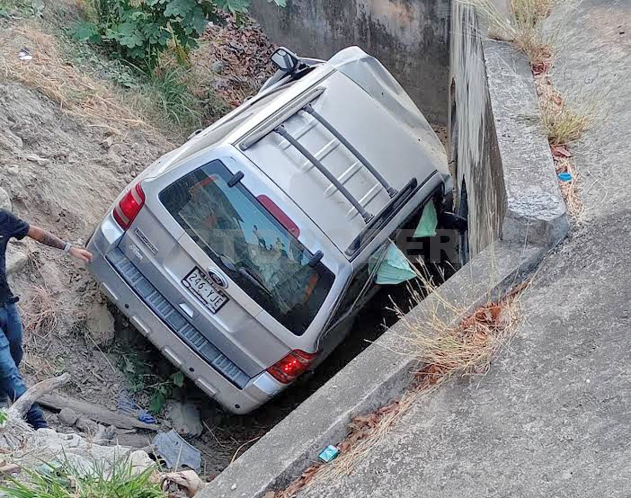 A su vez, el conductor del vehículo ante el fuerte impacto pierde el control, se sale de la carretera y queda incrustado entre una alcantarilla, a un costado de la cinta asfáltica.